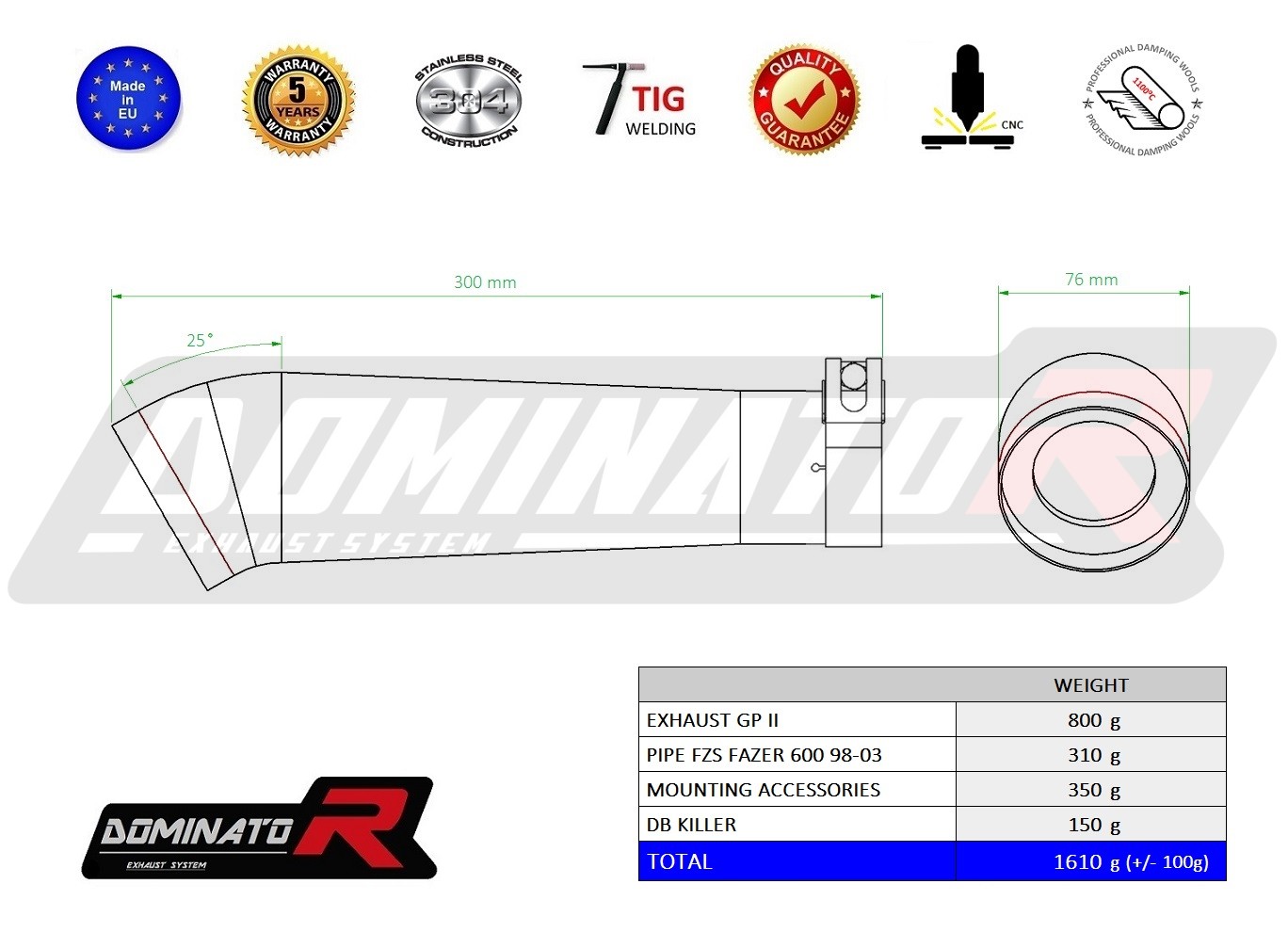 The Dominator Exhaust will change the nature of your motorcycle giving it a unique sound. The Exhaust system will increase the power and torque of the engine, while reducing the weight of the muffler.