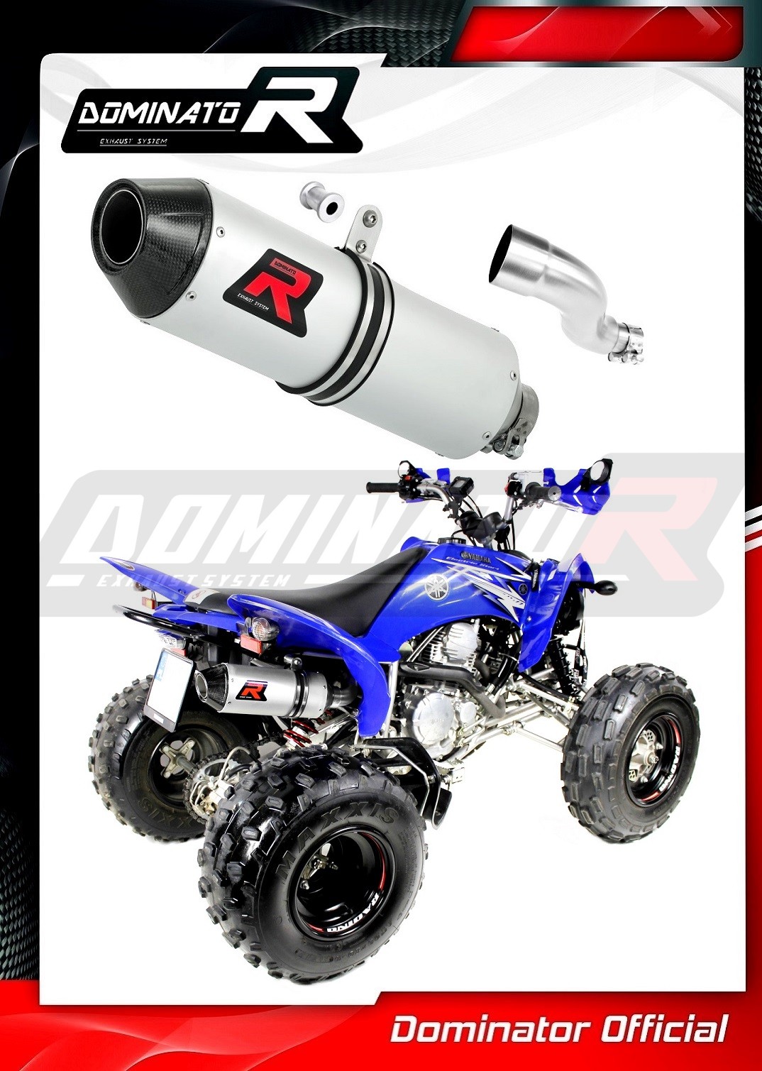 The Dominator Exhaust will change the nature of your quad giving it a unique sound. The Exhaust system will increase the power and torque of the engine, while reducing the weight of the muffler.